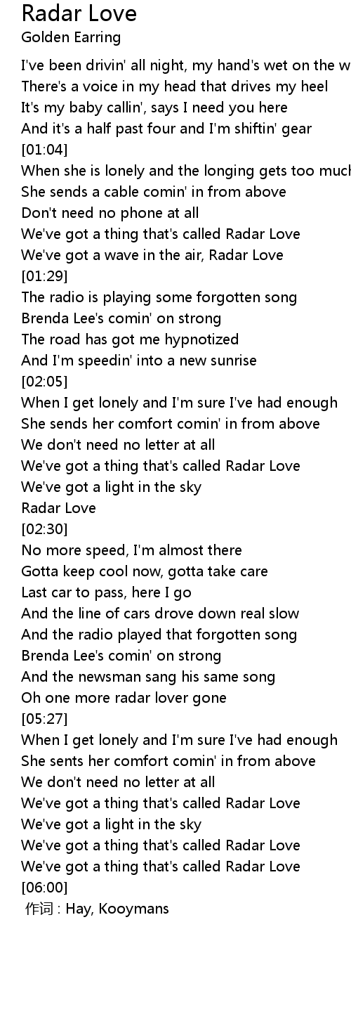 | [01:19] | We' ve got a thing that' s called Radar Love |