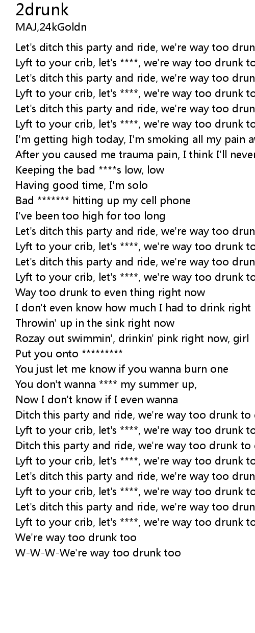 | [02:24.81] | Lyft to your crib, let's ****, we're way too drunk to |