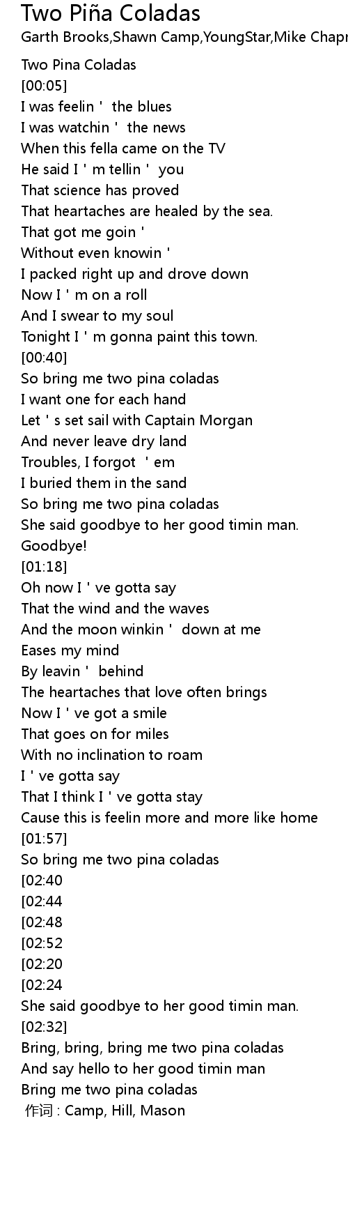 | [02:32] | Bring, bring, bring me two pina coladas |