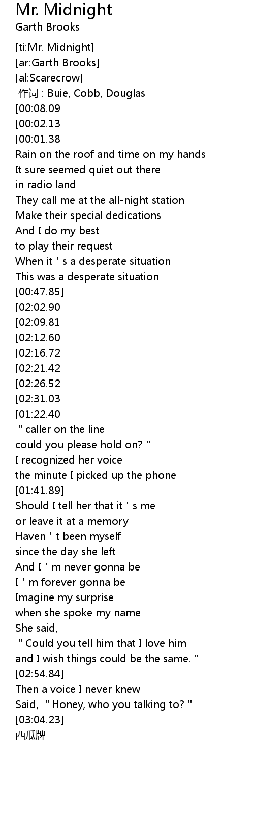 | [03:45.63][00:02.13] | Garth BrooksMr. Midnight |