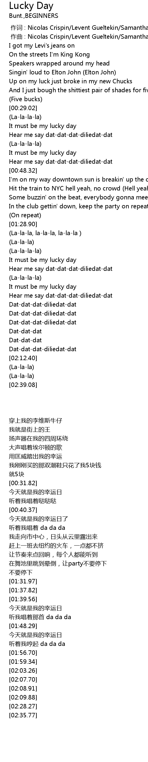 | [00:36.37] | Hear me say dat-dat-dat-diliedat-dat |