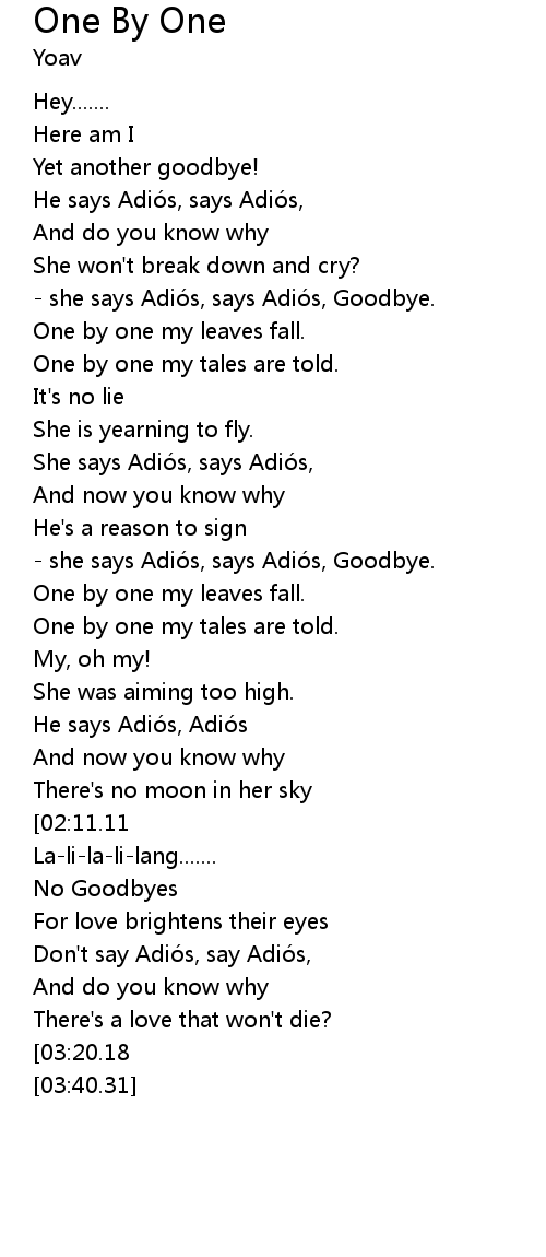 | [00:40.00] | - she says Adiós, says Adiós, Goodbye. |
