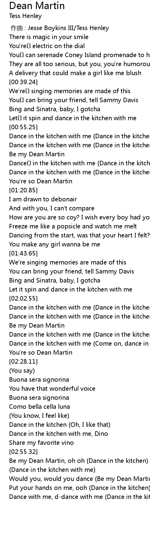 | [02:56.620] | Be my Dean Martin, oh oh (Dance in the kitchen) |