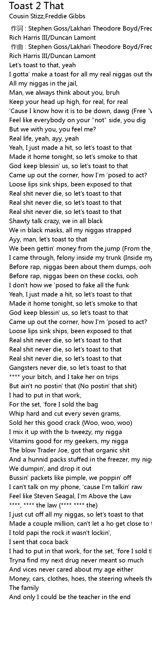 | [02:22.46] | And a hunnid packs stuffed in the freezer, my nigga |