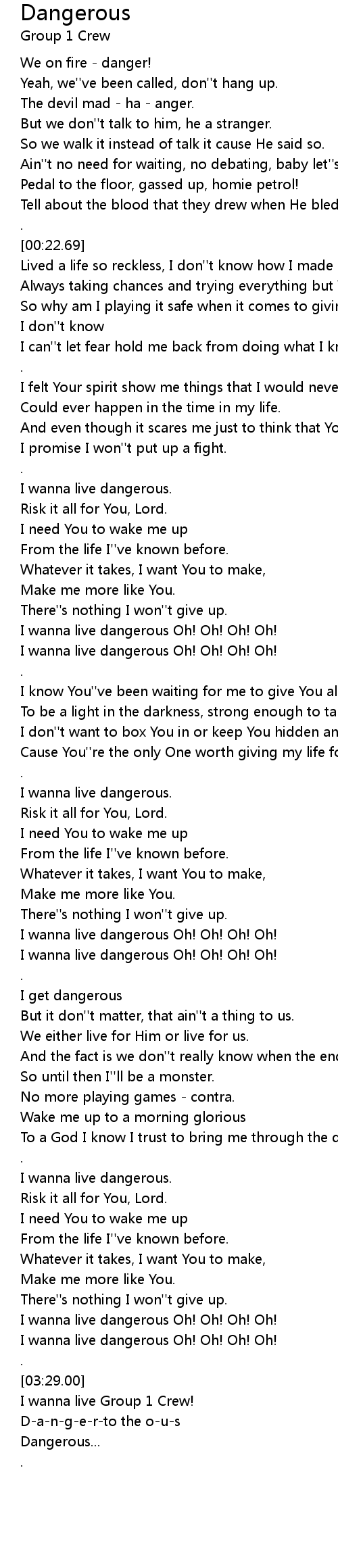 [03:15.48] I wanna live dangerous Oh! Oh! Oh! Oh!