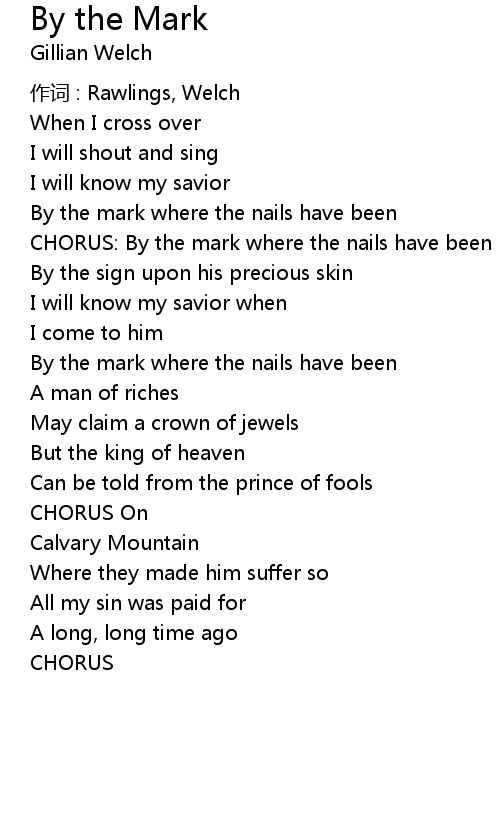 | CHORUS: By the mark where the nails have been | |