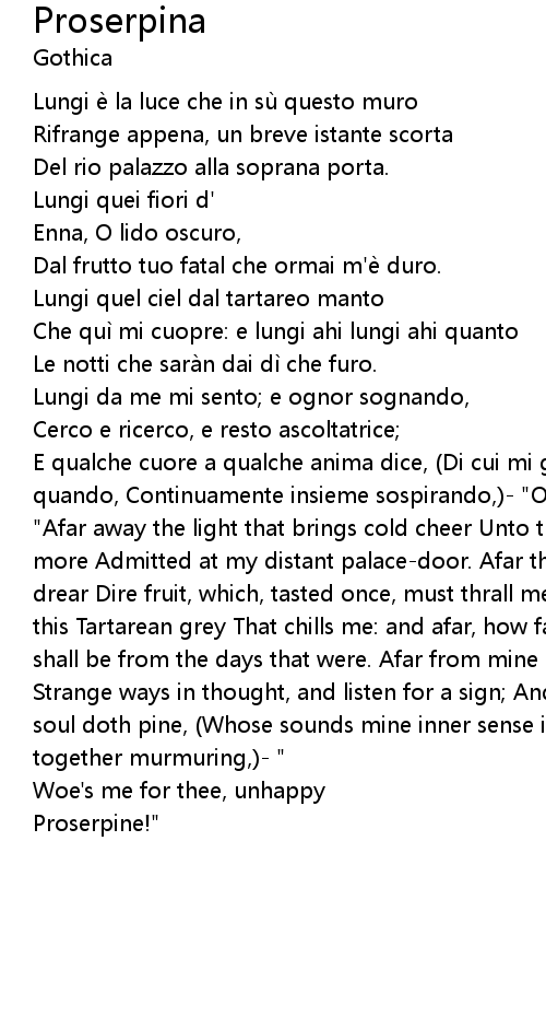 | E qualche cuore a qualche anima dice, Di cui mi giunge il suono da quando in quando, Continuamente insieme sospirando, " Oime per te, Proserpina infelice!" " Afar away the light that brings cold cheer Unto this wall, one instant and no more Admitted at my distant palacedoor. Afar the flowers of Enna from this drear Dire fruit, which, tasted once, must thrall me here. Afar those skies from this Tartarean grey That chills me: and afar, how far away, The nights that shall be from the days that were. Afar from mine own self I seem, and wing Strange ways in thought, and listen for a sign And still some heart unto some soul doth pine, Whose sounds mine inner sense is faith to bring, Continually together murmuring, " | |