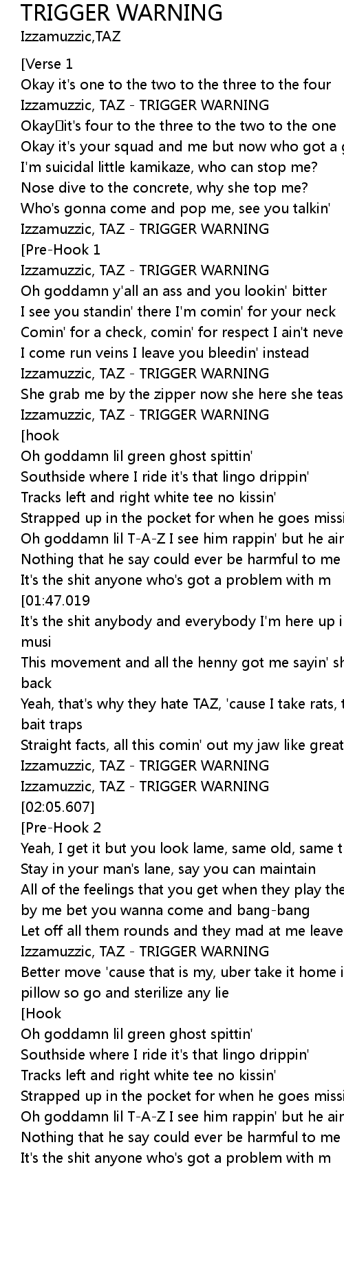 | [01:01.047] | Izzamuzzic, TAZ TRIGGER WARNING |