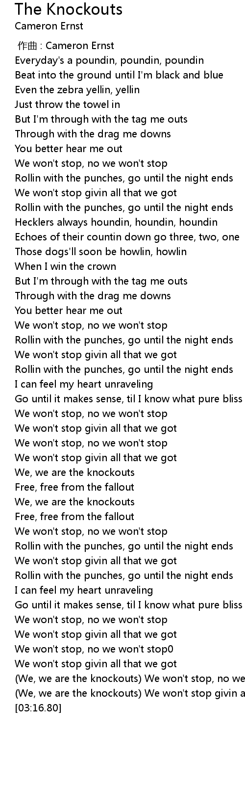 | [03:01.54] | (We, we are the knockouts) We won't stop, no we won't stop |