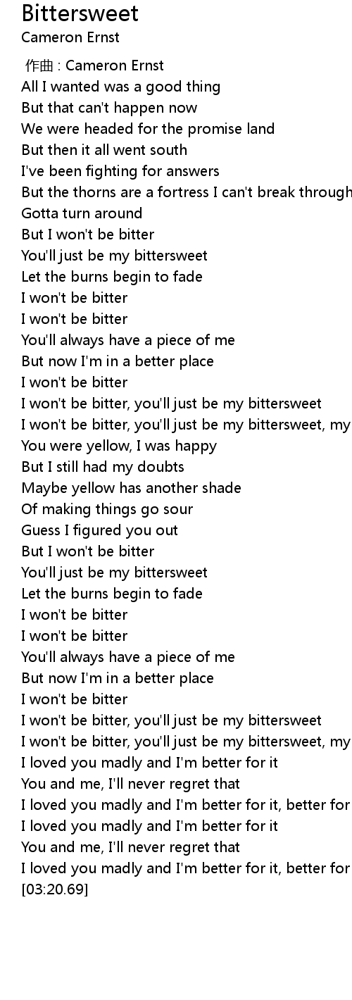 | [01:13.87] | I won' t be bitter, you' ll just be my bittersweet, my bittersweet |