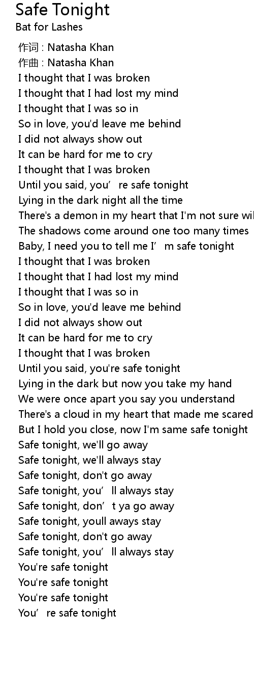 | [01:16.874] | Baby, I need you to tell me I' m safe tonight |
