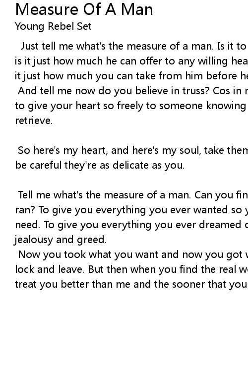 Just tell me what's the measure of a man. Is it to provide all that he can? Or is it just how much he can offer to any willing heart that will receive? Or is it just how much you can take from him before he truly sees? |