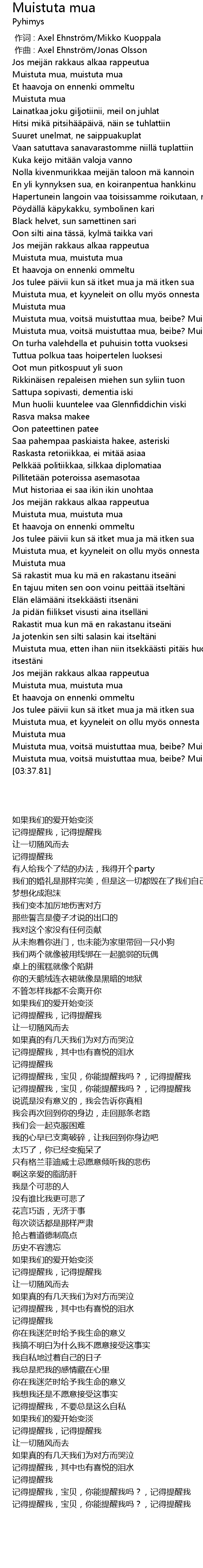 | [03:26.22] | Muistuta mua, voitsä muistuttaa mua, beibe? Muistuta mua |