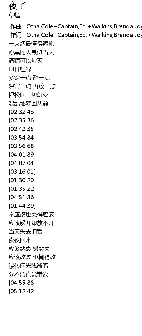 | [04:43.38][03:54.84][03:10.34][02:51.44][01:13.62] | 夜了 |