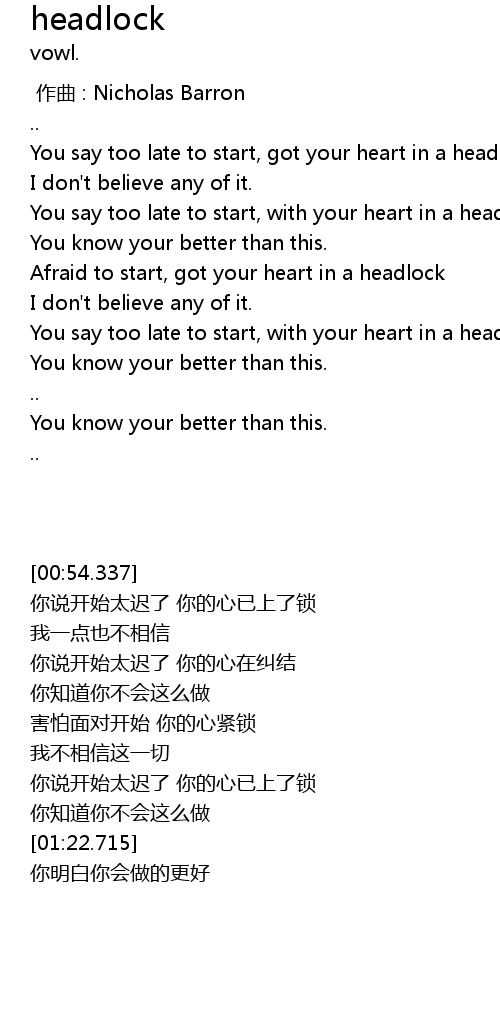 | [00:55.113] | You say too late to start, got your heart in a headlock |