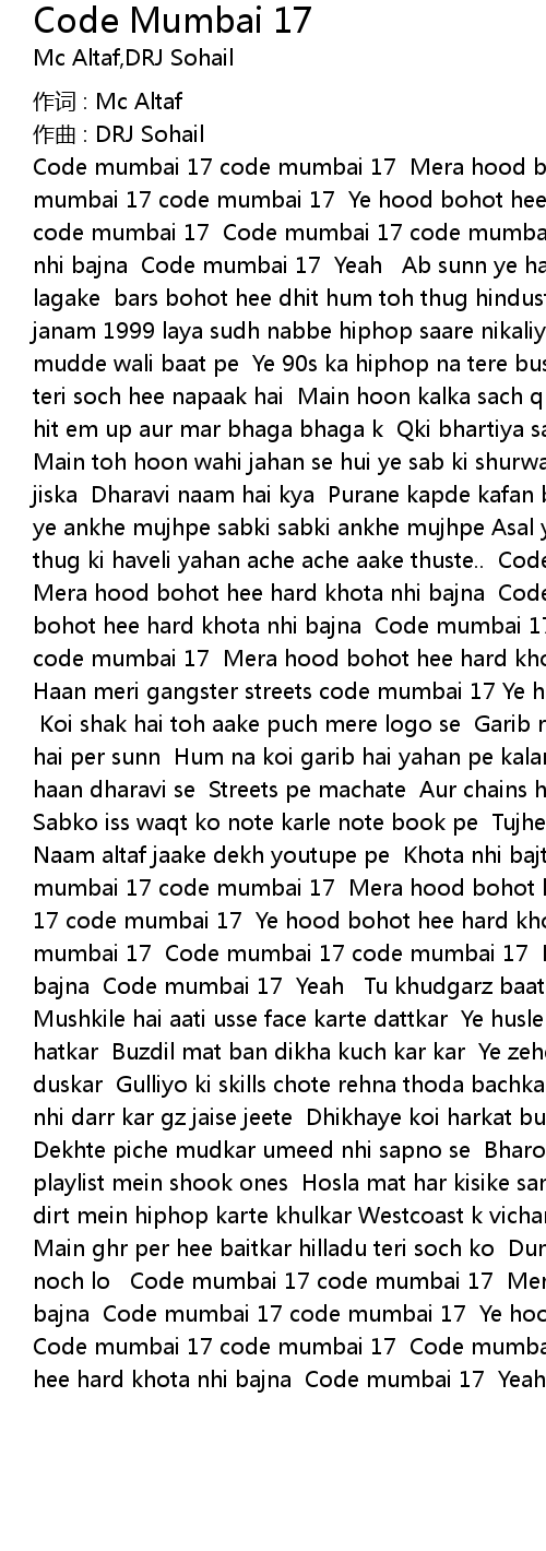 | Code mumbai 17 code mumbai 17 Mera hood bohot hee hard khota nhi bajna Code mumbai 17 code mumbai 17 Ye hood bohot hee hard khota nhi bajna Code mumbai 17 code mumbai 17 Code mumbai 17 code mumbai 17 Mera hood bohot hee hard khota nhi bajna Code mumbai 17 Yeah Ab sunn ye hardcore boom bap dhiyan se kaan lagake bars bohot hee dhit hum toh thug hindustan k Ye sab haq wala scene janam 1999 laya sudh nabbe hiphop saare nikaliyo ki faad k Ab chodo sab aate mudde wali baat pe Ye 90s ka hiphop na tere bus ki baat hai Na tu gangster teri soch hee napaak hai Main hoon kalka sach qki kaano mein wutang hai Baja hit em up aur mar bhaga bhaga k Qki bhartiya sangeet na ghulam labels k aage Main toh hoon wahi jahan se hui ye sab ki shurwat hai hiphop headquater hood jiska Dharavi naam hai kya Purane kapde kafan baand k woh ghumta sir pe Sabki ye ankhe mujhpe sabki sabki ankhe mujhpe Asal ye zindagi baki saalw zinda murde thug ki haveli yahan ache ache aake thuste.. Code mumbai 17 code mumbai 17 Mera hood bohot hee hard khota nhi bajna Code mumbai 17 code mumbai 17 Ye hood bohot hee hard khota nhi bajna Code mumbai 17 code mumbai 17 Code mumbai 17 code mumbai 17 Mera hood bohot hee hard khota nhi bajna Code mumbai 17 Yeah Haan meri gangster streets code mumbai 17 Ye hood bohot hee hard khota nhi bajna Koi shak hai toh aake puch mere logo se Garib rapper sab cartoon jaise pogo hai per sunn Hum na koi garib hai yahan pe kalam uthale jo ek bar sabki lagade haan dharavi se Streets pe machate Aur chains hai gaale mein adidas bhi pinate Sabko iss waqt ko note karle note book pe Tujhe ek gaana kafi bina kisi hook k Naam altaf jaake dekh youtupe pe Khota nhi bajte sangeet k bhooke hum Code mumbai 17 code mumbai 17 Mera hood bohot hee hard khota nhi bajna Code mumbai 17 code mumbai 17 Ye hood bohot hee hard khota nhi bajna Code mumbai 17 code mumbai 17 Code mumbai 17 code mumbai 17 Mera hood bohot hee hard khota nhi bajna Code mumbai 17 Yeah Tu khudgarz baatein karta fake chote bus kar Mushkile hai aati usse face karte dattkar Ye husle hai zindagi aur soch bhi hai hatkar Buzdil mat ban dikha kuch kar kar Ye zeherila flow mera nikle sabko duskar Gulliyo ki skills chote rehna thoda bachkar Samne se var karte rehte nhi darr kar gz jaise jeete Dhikhaye koi harkat bus aage badte jaate nhi Dekhte piche mudkar umeed nhi sapno se Bharosa rakhte khudper 90s ki trip aur playlist mein shook ones Hosla mat har kisike samne jhuk mat Streets ki iss dirt mein hiphop karte khulkar Westcoast k vichar jo humesha chadte sir per Main ghr per hee baitkar hilladu teri soch ko Dum hai kisi mein toh aage aake noch lo Code mumbai 17 code mumbai 17 Mera hood bohot hee hard khota nhi bajna Code mumbai 17 code mumbai 17 Ye hood bohot hee hard khota nhi bajna Code mumbai 17 code mumbai 17 Code mumbai 17 code mumbai 17 Mera hood bohot hee hard khota nhi bajna Code mumbai 17 Yeah |