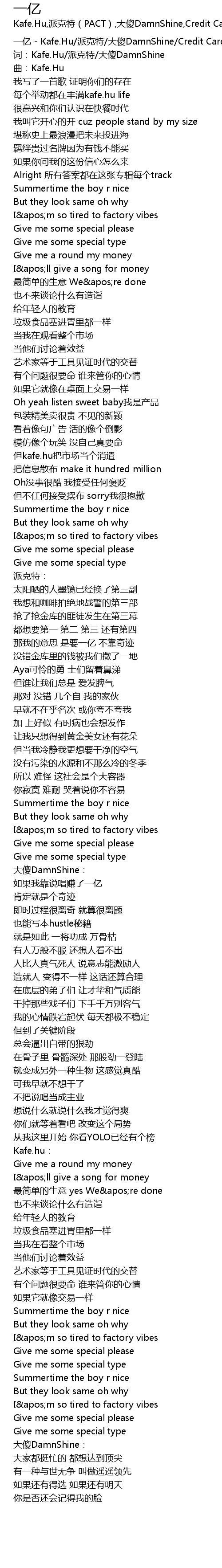 | [00:00.00] | 一亿 - Kafe.Hu/派克特/大傻DamnShine/Credit Card |