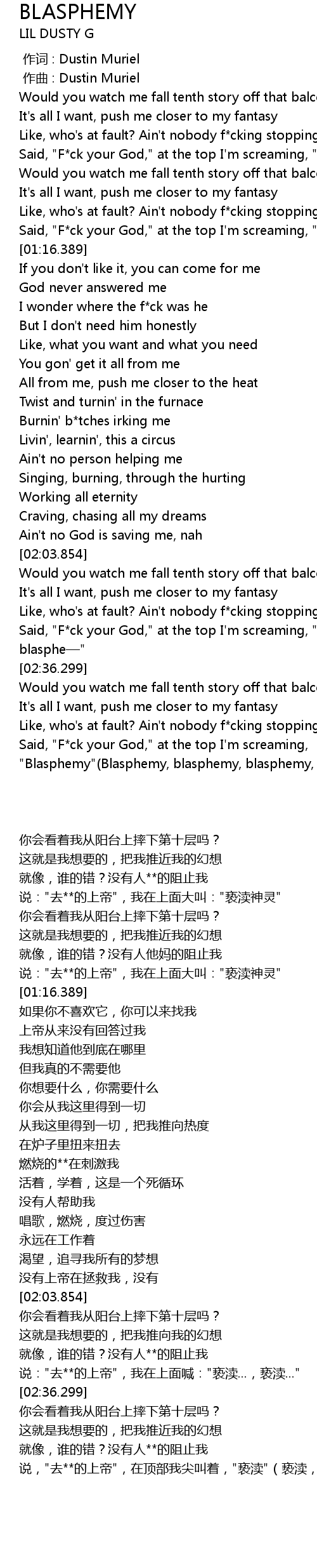 | [02:53.905] | Said, "F*ck your God," at the top I'm screaming, "Blasphemy"(Blasphemy, blasphemy, blasphemy, blasphemy, blasphemy) |
