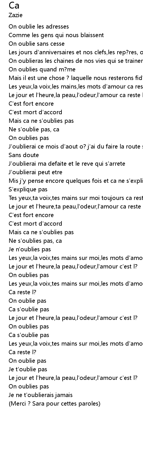 | Les yeux,la voix,tes mains sur moi,les mots d'amour ca reste l? | |