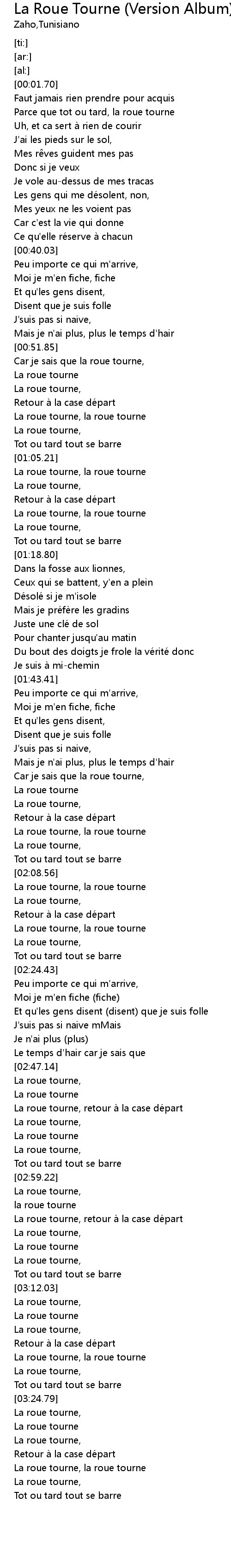 | [00:05.90] | Parce que tot ou tard, la roue tourne |