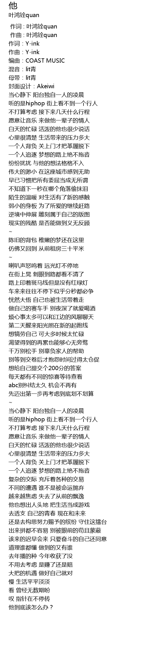 | [00:01.000] | 作曲 : 叶鸿铨quan |