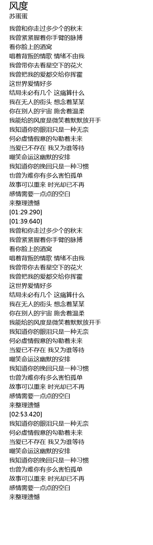 | [02:16.090] | 我能给的风度是微笑着默默放开手 |