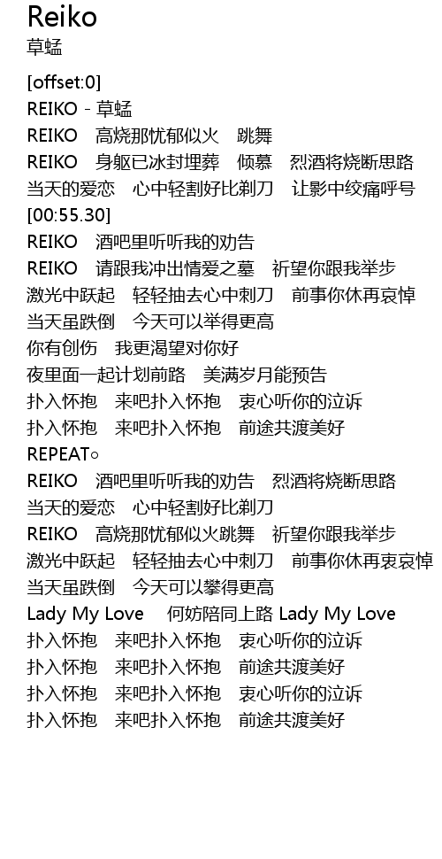 | [02:31.61] | REIKO 高烧那忧郁似火跳舞 祈望你跟我举步 |