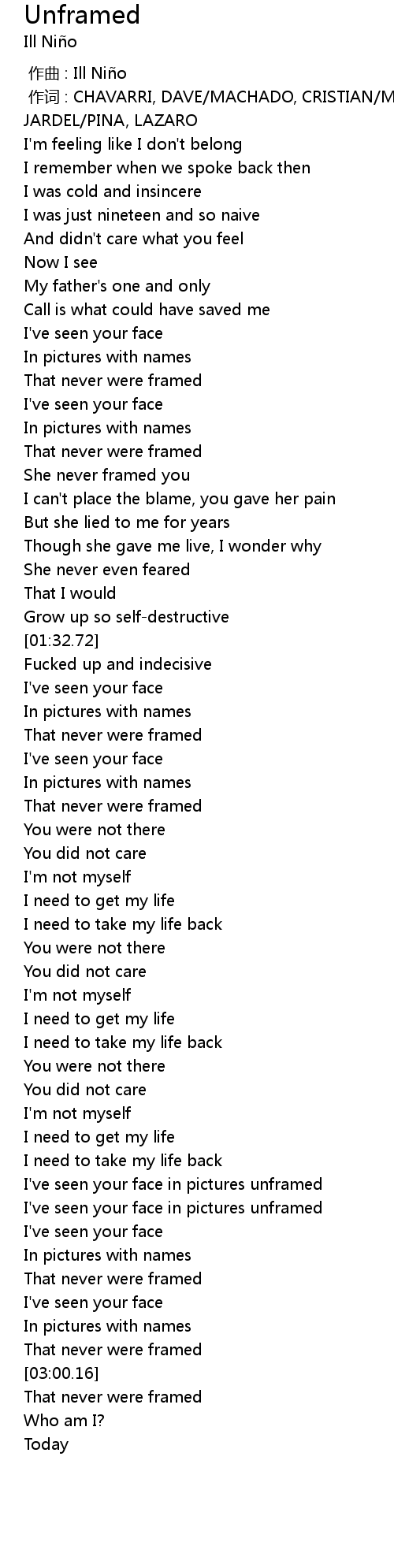 | [02:22.07] | I' ve seen your face in pictures unframed |