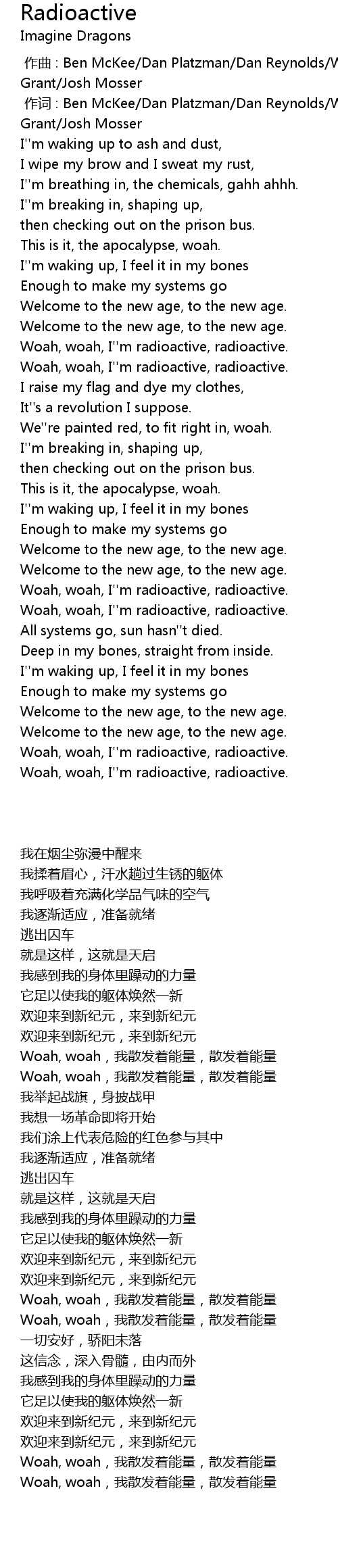 | [02:14.750] | Woah, woah, I'' m radioactive, radioactive. |