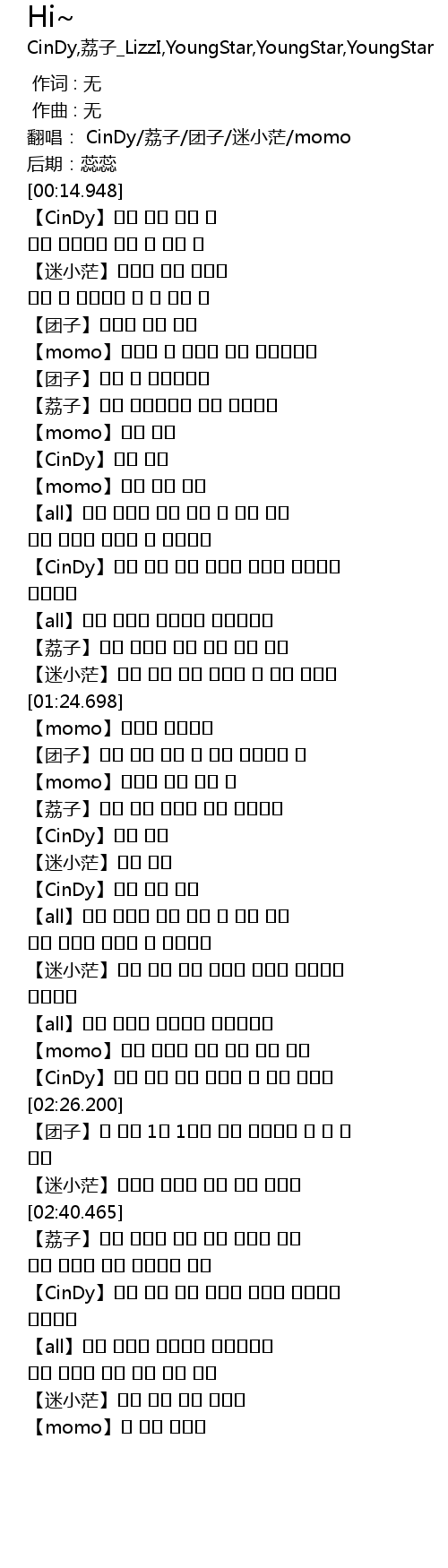 | [00:01.698] | 翻唱: CinDy/荔子/团子/迷小茫/momo |
