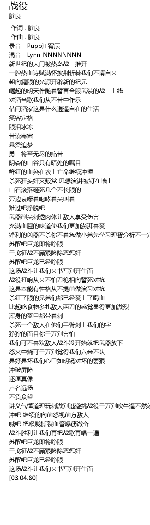 | [01:43.92] | 战役打响从来不怕刀枪相向誓死对抗 |
