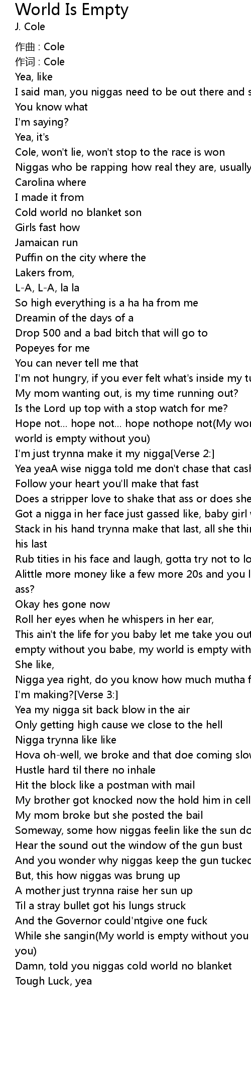 | This ain' t the life for you baby let me take you out of here cause. My world is empty without you babe, my world is empty without you | |