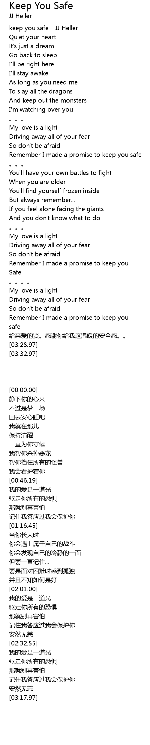 | [00:00.00] | keep you safe—JJ Heller |