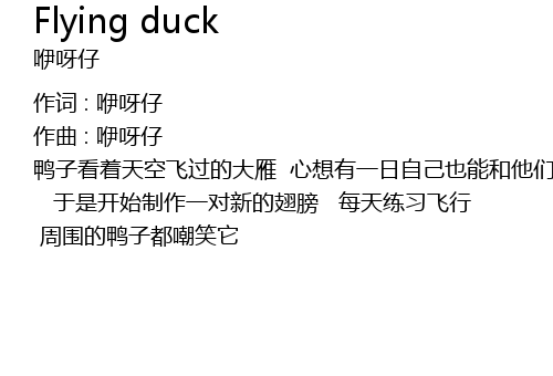 | 鸭子看着天空飞过的大雁 心想有一日自己也能和他们翱翔 于是开始制作一对新的翅膀 每天练习飞行 周围的鸭子都嘲笑它 |