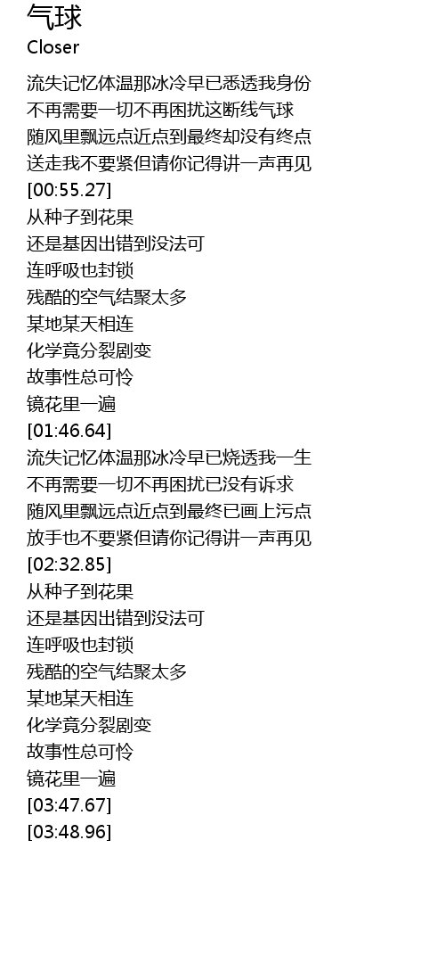 | [00:24.82] | 不再需要一切不再困扰这断线气球 |
