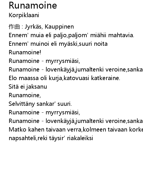 | Runamoine - lovenkäyjä,jumaltenki veroine,sankareista suuremmoisin! | |