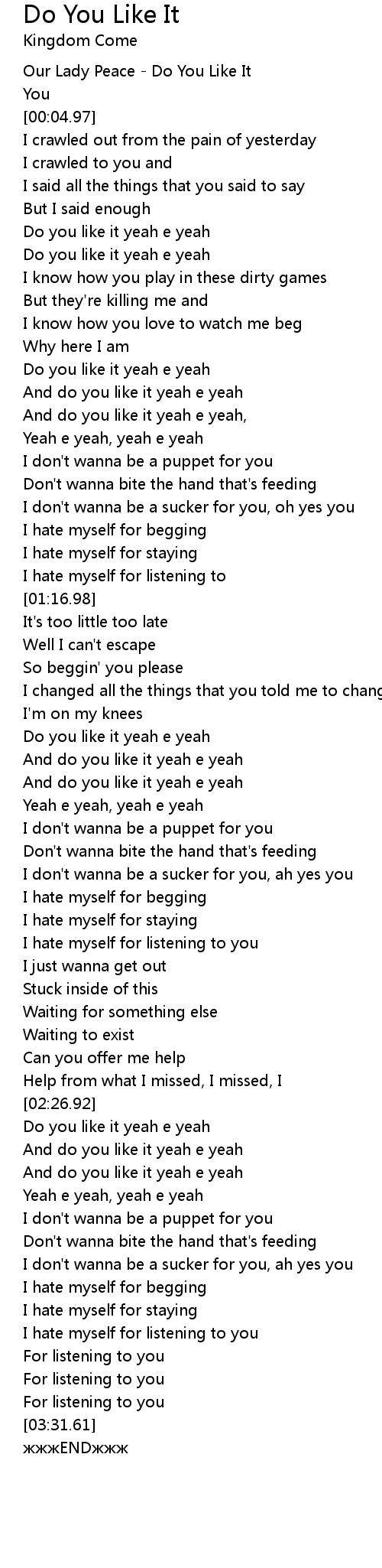 | [00:22.13] | Do you like it yeah e yeah |