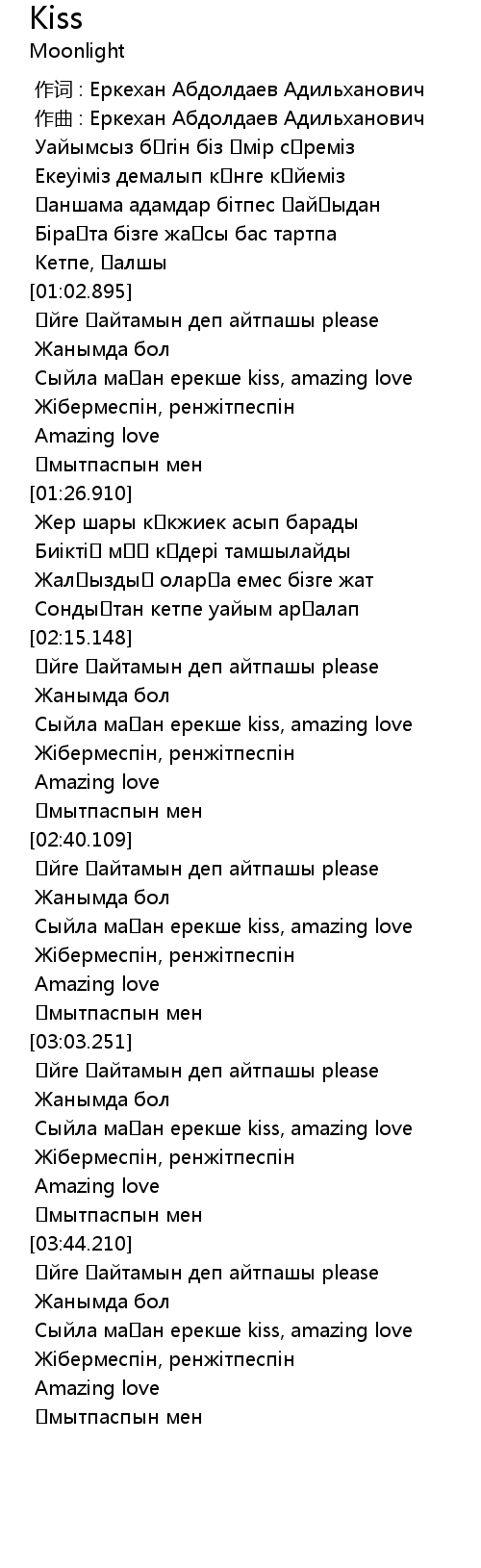 | [02:24.278] | Сыйла маған ерекше kiss, amazing love |