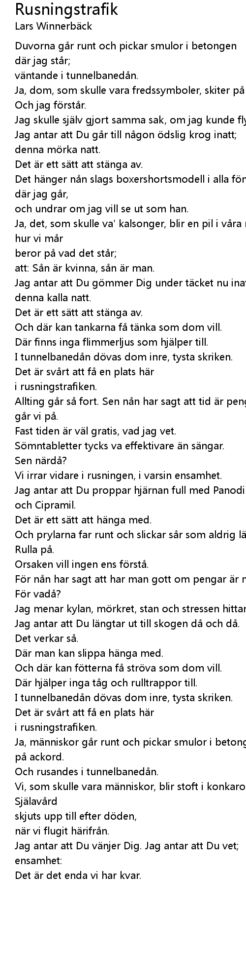 | Vi irrar vidare i rusningen, i varsin ensamhet. | |