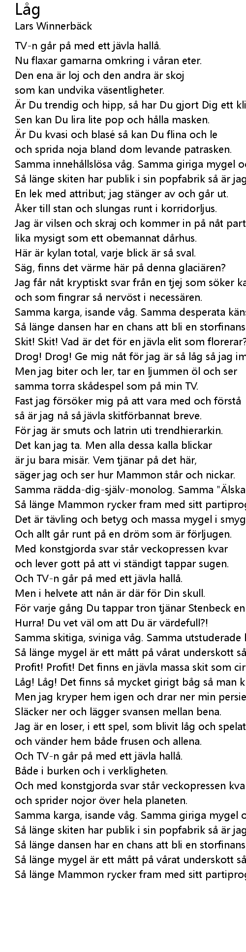 | Så länge Mammon rycker fram med sitt partiprogram så är jag låg. | |