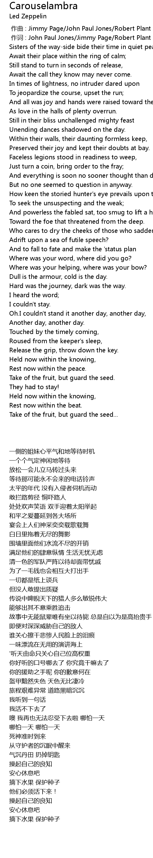 | [00:01.00] | 作词 : John Paul Jones/Jimmy Page/Robert Plant |