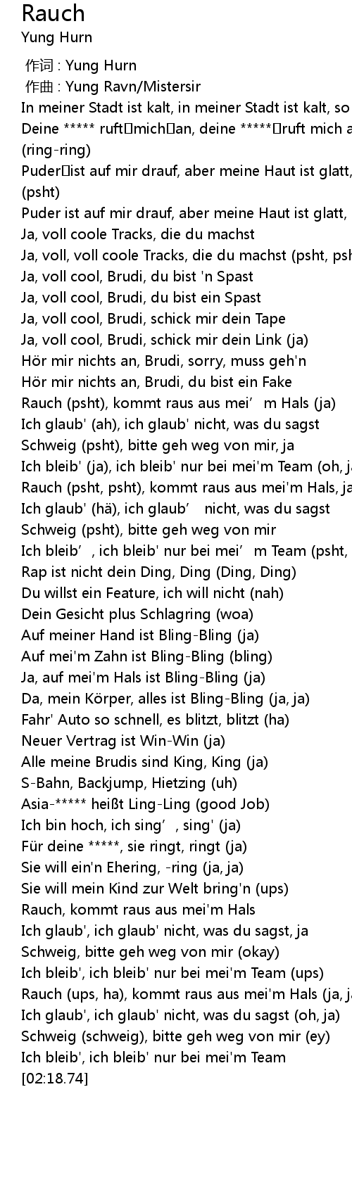 | [02:00.21] | Rauch ups, ha, kommt raus aus mei' m Hals ja, ja |