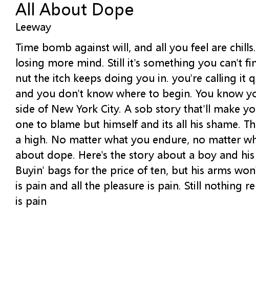 | Time bomb against will, and all you feel are chills. You' re doing more time and losing more mind. Still it' s something you can' t find. Keep on trying to win, nut the itch keeps doing you in. you' re calling it quits, but the shoes fits, and you don' t know where to begin. You know you got it all wrong. The lower east side of New York City. A sob story that' ll make you pity. Boys In a game with no one to blame but himself and its all his shame. There is no answer in search for a high. No matter what you endure, no matter what you try cause it' s all about dope. Here' s the story about a boy and his plan. Trying to be a man. Buyin' bags for the price of ten, but his arms won' t mend. Within the pleasure is pain and all the pleasure is pain. Still nothing remains and all the pleasure is pain |
