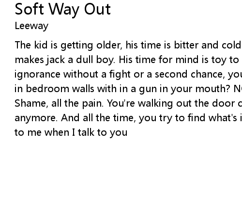 | The kid is getting older, his time is bitter and colder. All work and no play makes jack a dull boy. His time for mind is toy to destroy. A cop out, on ignorance without a fight or a second chance, you think it's the only way out, in bedroom walls with in a gun in your mouth? NO! You leave behind the guilt. Shame, all the pain. You're walking out the door cause you can't take it anymore. And all the time, you try to find what's inside. Soft way out. Listen to me when I talk to you |