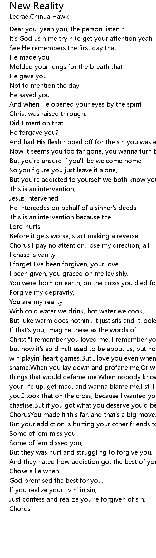| Christ:"I remember you loved me, I remember your light.It used to shine bright, but now it's so dim.It used to be about us, but now it's 'bout them.You can't win playin' heart games,But I love you even when your light's off in your dark shame.When you lay down and profane me,Or when your bloodstream contains the things that would defame me.When nobody knows that you claim me.Or when you mess your life up, get mad, and wanna blame me.I still want you back. I won't punish you.I took that on the cross, because I wanted you.I might discipline and chastise,But if you got what you deserve you'd be in hell with other bad guys." | |