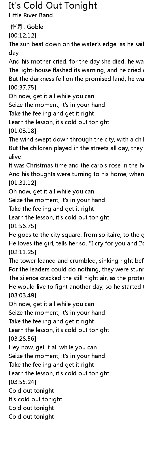 | [00:59.44] | Learn the lesson, it' s cold out tonight |
