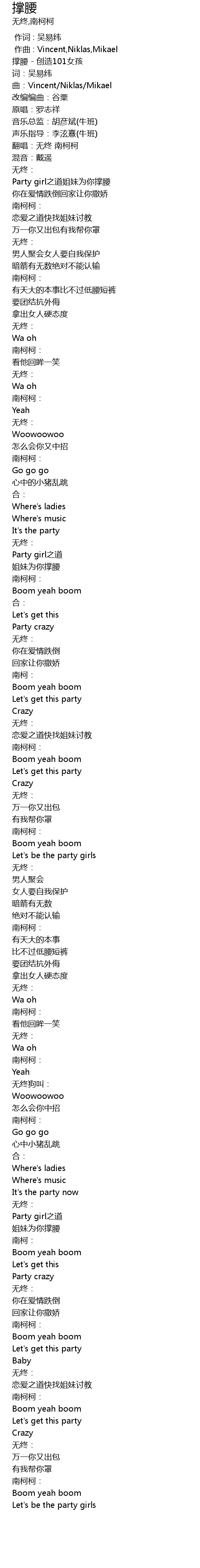 | [00:10.533] | Party girl zhī dào jiě mèi wèi nǐ chēng yāo |