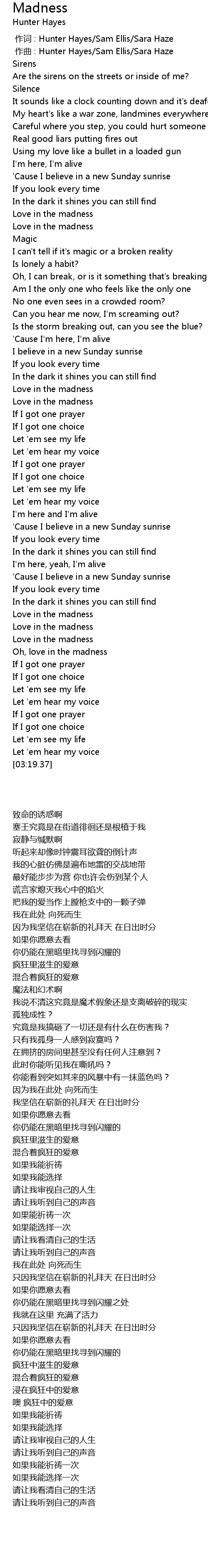 | [00:01.00] | zuo qu : Hunter Hayes Sam Ellis Sara Haze |
