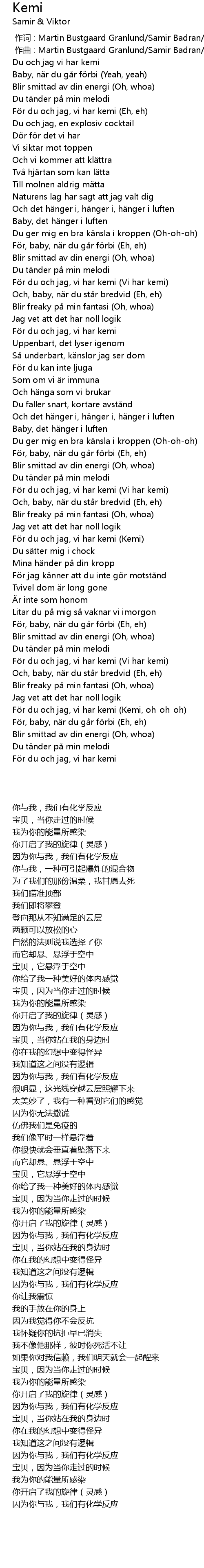 | [02:24.64] | F r du och jag, vi har kemi Kemi, ohohoh |