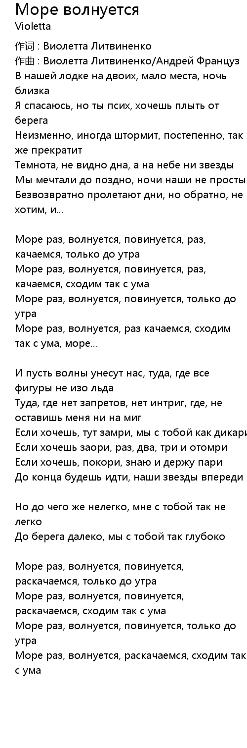 Море раз, волнуется, раз качаемся, сходим так с ума, море… |